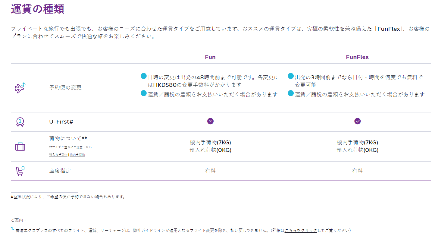 荷物が少ないバックパッカー、お得に旅をしたいスマートトラベラー、便利に旅行したいグループ旅行、さらに友人や家族との旅行にすべてのオプション込みをご希望のお客様など、香港エクスプレスはそれぞれのニーズに合った運賃タイプをご用意しています。ご自身のご希望にぴったりの運賃タイプを選び、さらに必要なサービスを追加してフライトをカスタマイズしてください。香港エクスプレスなら、柔軟に、思い通りの旅行が実現可能です。今すぐ次の旅行をご予約ください!