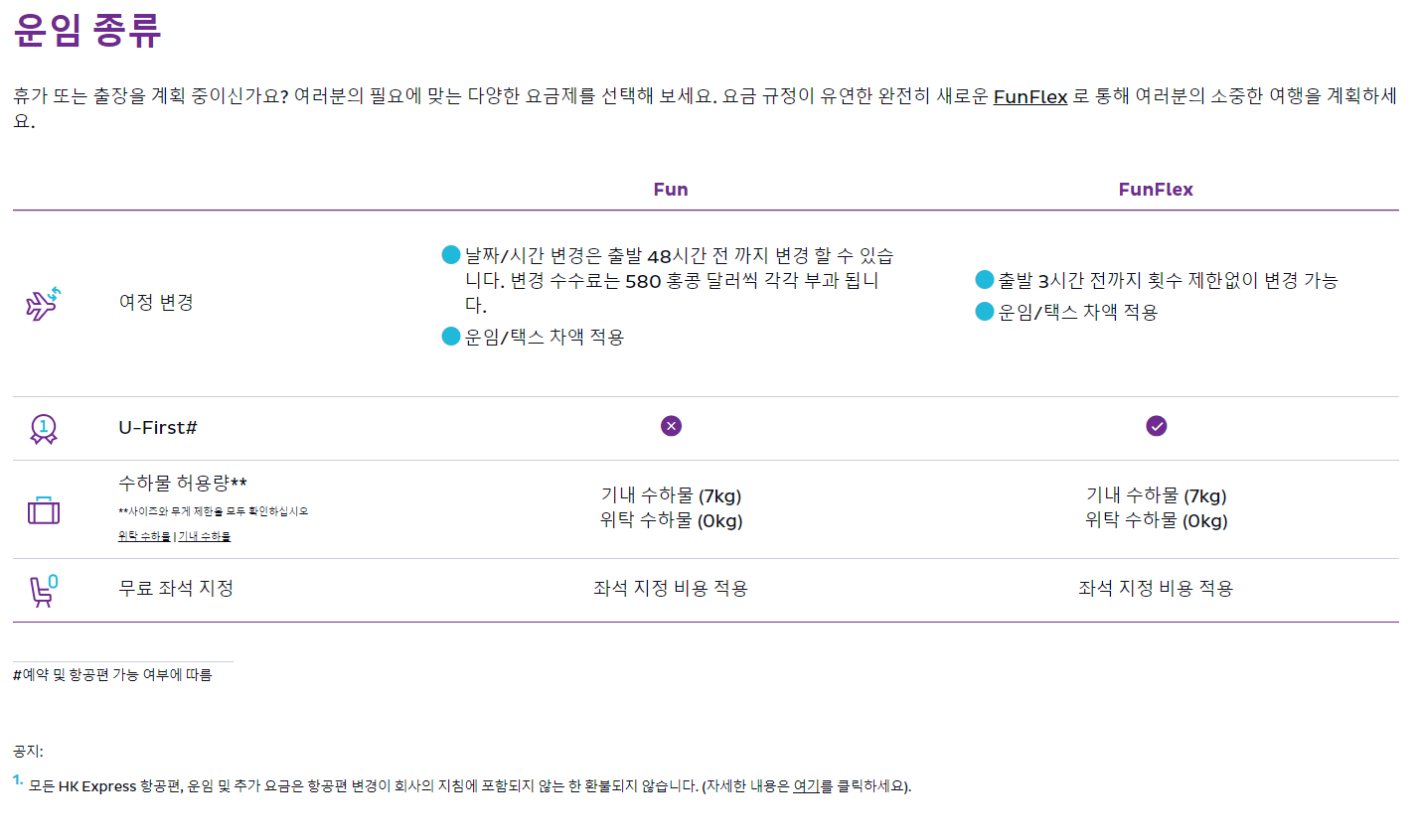 | 항공편 변경 | 항공편 출발 48시간 전까지 날짜/시간 변경이 가능합니다. 각 구간의 변경에는 HKD 580의 수수료가 부과됩니다. 또한 운임/세금 차액이 적용될 수 있습니다. 예약 날짜 및 항공편 상황에 따라 달라질 수 있습니다. | |||